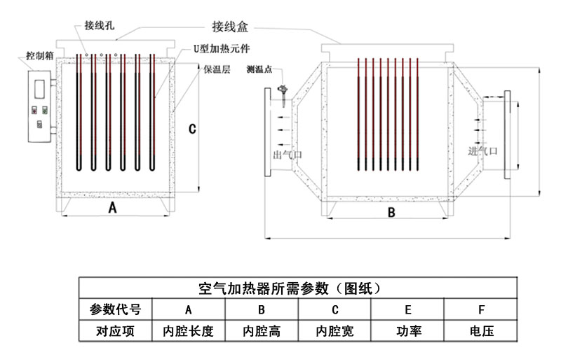 空氣加熱器主要用于風(fēng)道中的空氣加熱,規(guī)格分低溫、中溫、高溫三種型式,在結(jié)構(gòu)上的共同之處是采用了鋼板支撐電熱管以減少風(fēng)機停止時電熱管的震動,在接線盒中都裝有超溫控制裝置。低溫型可直接安裝在風(fēng)道上,而中溫型、高溫型由于結(jié)構(gòu)上的不同,在通道外壁至加熱器接線盒夾有100mm厚的保溫材料,一方面減少整個通道的對外散熱,另一方面也減少了接線腔內(nèi)的溫度。