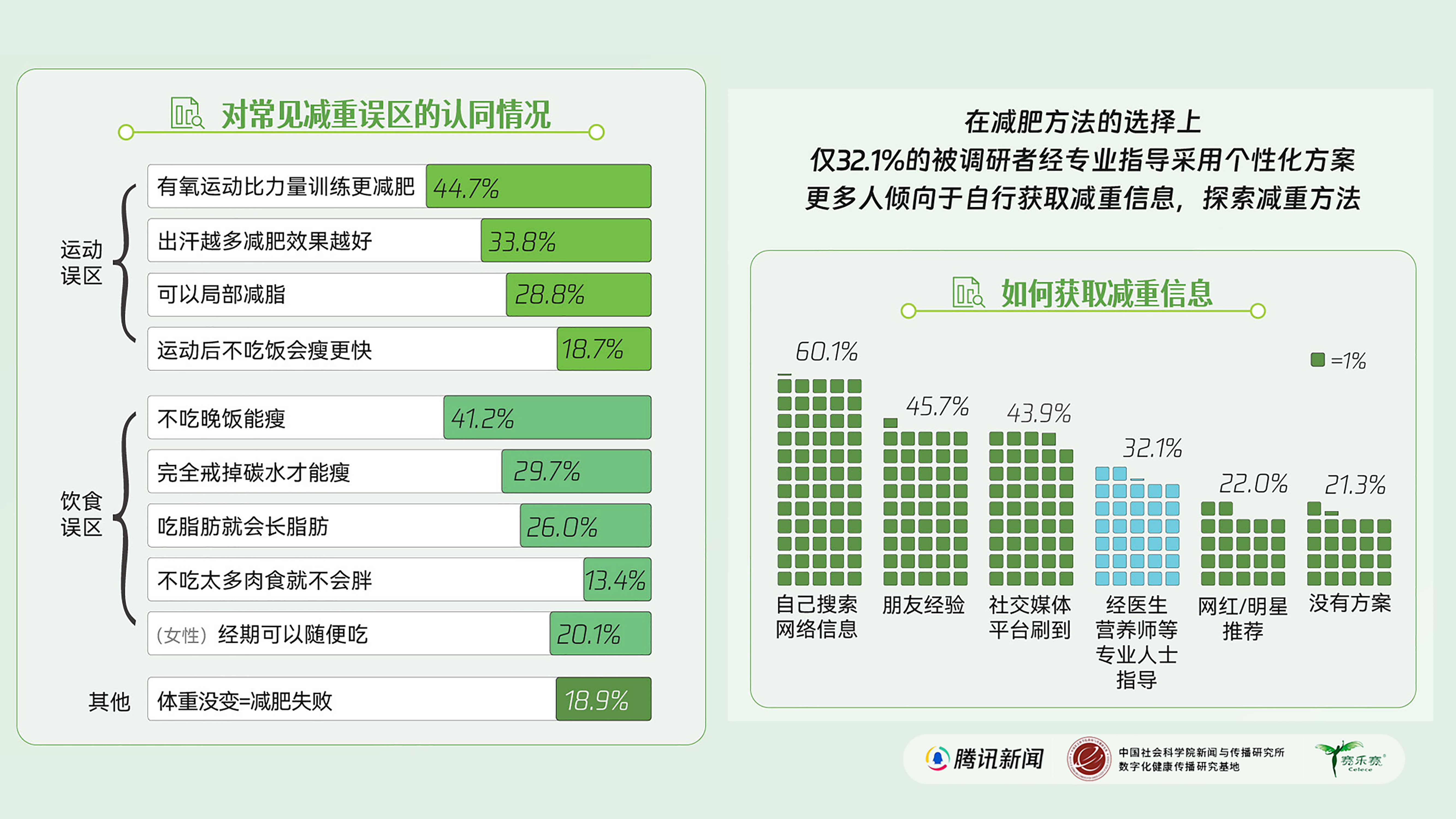 《藍皮書》揭示了大眾在減重認(rèn)知上存在顯著誤區(qū)。近半數(shù)(47.6%)的被調(diào)研者高估了運動的作用,認(rèn)為運動與飲食同等重要或運動更為關(guān)鍵。同時,流行于網(wǎng)絡(luò)的片面或錯誤觀點仍被大量人群認(rèn)同,例如,44.7%的人認(rèn)為“有氧運動比力量訓(xùn)練更減肥”,41.2%的人相信“不吃晚飯能瘦”。