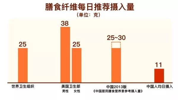 但根據中國居民營養健康狀況監測結果表明,國人每人每天平均膳食纖維攝入量僅為10.9g,還不及推薦攝入量的一半!