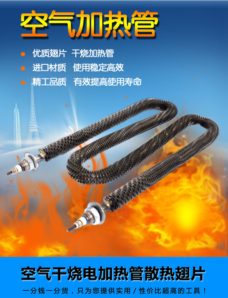 W型翅片空氣電加熱管采用優質不銹鋼、進口氧化鏷粉、高電阻電熱合金絲、不銹鋼散熱片等材料,通過先進的生產設備和工藝制作而成,翅片電加熱管可以安裝在吹風管道中或其它靜止、流動空氣的加熱場合。它與普通加熱管相比,散熱面積擴大了2~3倍,即翅片元件所允許的表面功率負荷是普通元件的3~4倍。由于元件的長度縮短,使得本身的熱損失減小,在相同的功率條件下,具有升溫快、發熱均勻、散熱性能好、熱效率高、使用壽命長、加熱裝置體積小,成本低等優點。根據用戶要求進行了合理的設計,便于安裝。產品在機械制造、汽車、紡織、食品、家電等行業,尤其在空調器風幕行業得到廣泛應用。