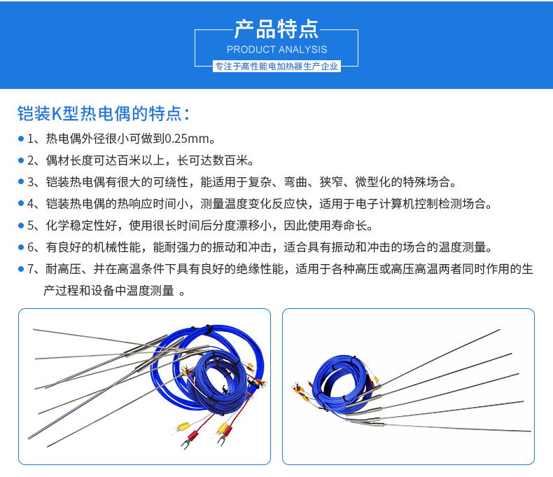 4、鎧裝熱電偶的熱響應時間小,測量溫度變化反應快,適用于電子計算機控制檢測場合。