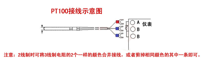 3線(xiàn)制pt100一般是一根紅線(xiàn)二根白線(xiàn),紅線(xiàn)為A,二根白線(xiàn)都是B,二根B線(xiàn)(白線(xiàn))都是一樣的,可以按標(biāo)識(shí)的A.B.B接口接上線(xiàn)即可。PT100是一個(gè)可變電阻,阻值隨溫度的變化而變化,當(dāng)溫度在0度的時(shí)候,量測(cè)AB(紅白)兩根線(xiàn)的阻值是100歐,100度是138.5歐,有兩根白線(xiàn)是因?yàn)槠渲幸桓拙€(xiàn)為補(bǔ)償線(xiàn),也可以?xún)蓷l白線(xiàn)裝在一個(gè)接口當(dāng)兩線(xiàn)用,接三線(xiàn)是為了抗干擾,這樣可以減少反饋到控制器的誤差。